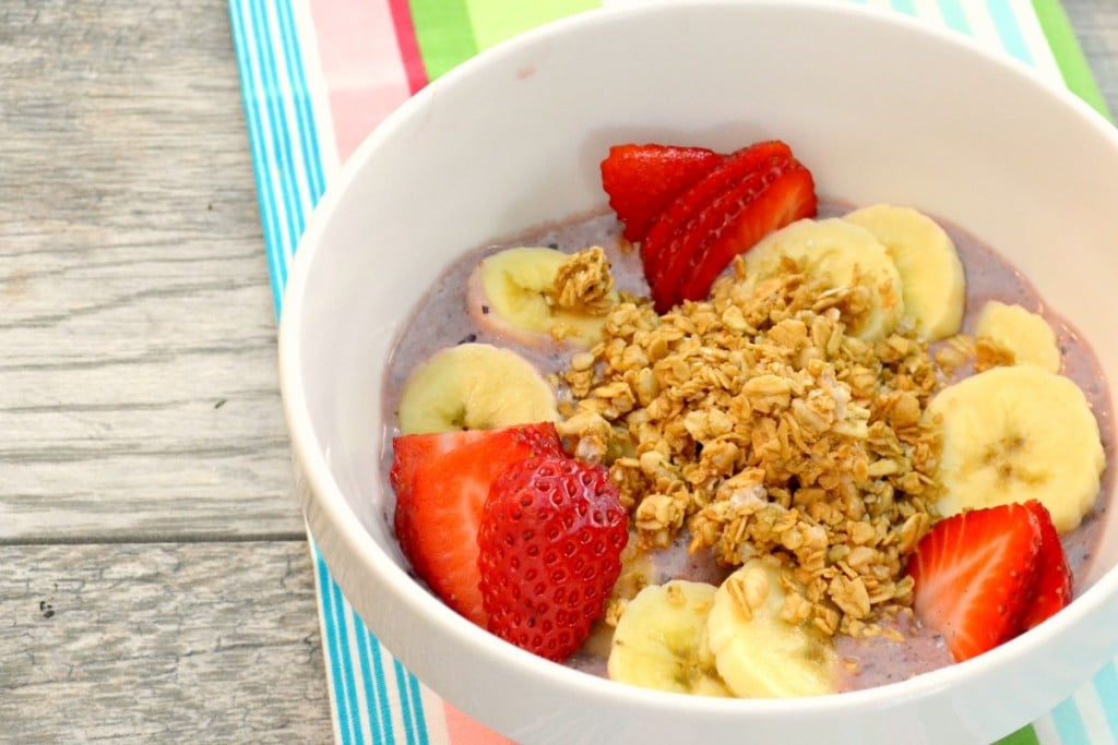 - Put all of the smoothie ingredients in the blender and blend until smooth. Pour equal amounts into two or three bowls (depending on how hungry you are) and top with the toppings.